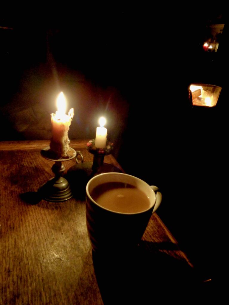 There is a steady rain falling this morning as I find myself wide awake a little after four o’clock. Behind the clouds the moon shines brightly, casting a ghostly illumination over everything. Despite the power being off, there is enough light for me to make my way into the living room where I kindle a fire in the wood stove and put the kettle on. Here and there candles glow, bringing a warmth to the room even before the heat of the fire reaches me. It is a peaceful start to the day.